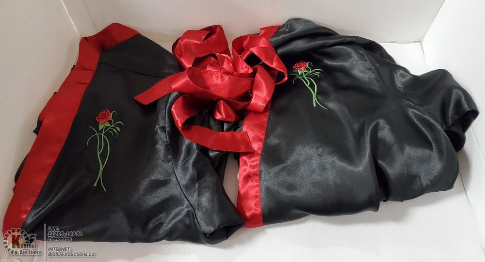 2 ROBES, BLACK POLYESTER SATIN WITH RED TRIM, SASH, ROSE EMBROIDERED MOTIF