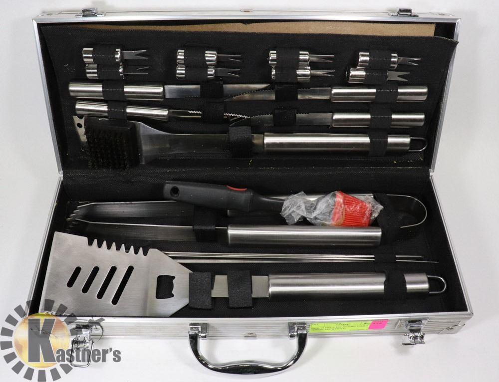 NEW 20 PIECE SET OF BBQ TOOLS - TONGS, SKEWERS(4)