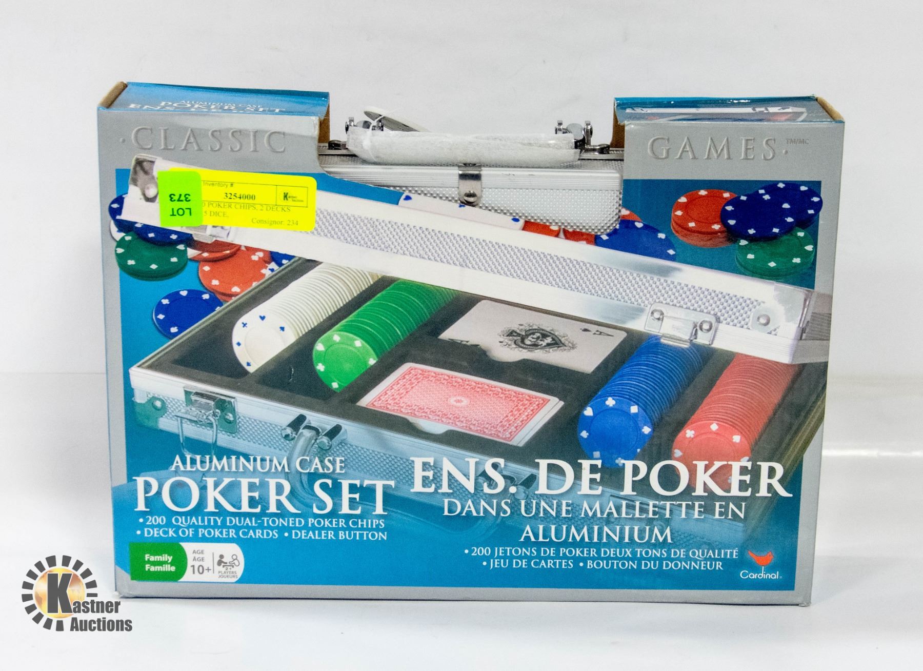 NEW 200 POKER CHIPS, 2 DECKS CARDS, 5 DICE,