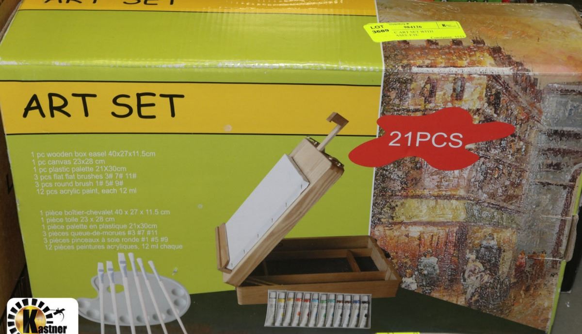 NEW 21 PC ART SET WITH PAINTS,EASEL ETC