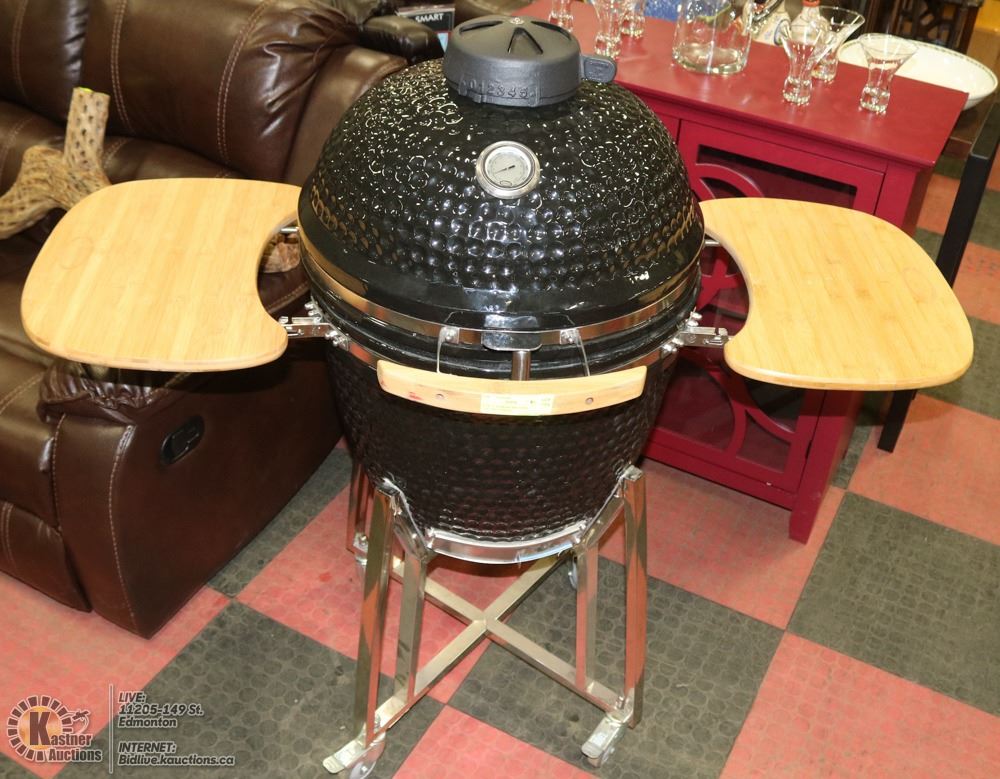 573 SQ INCHES TOTAL COOKING AREA, LARGE STAINLESS STEEL CALIBRATED TOP DAMPER, COOKING TEMP RANGE UP TO 700 DEGREES FAHRENHEIT, USES CHARCOAL. OUTDOOR.