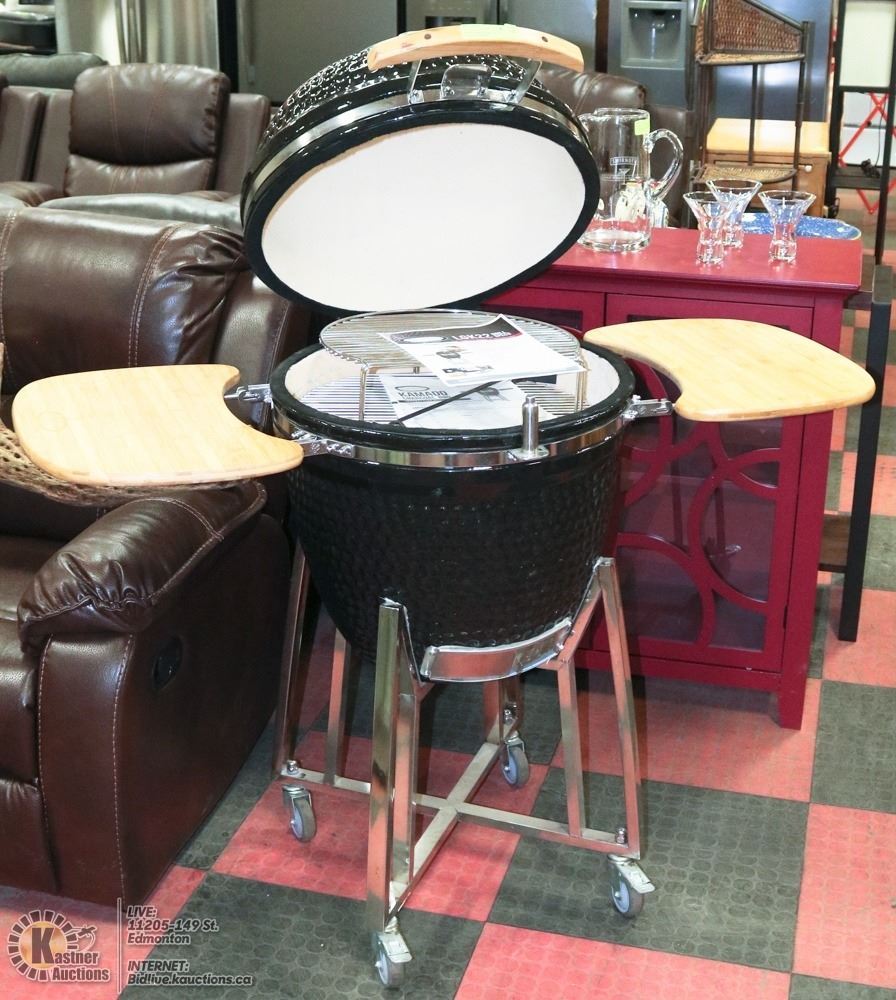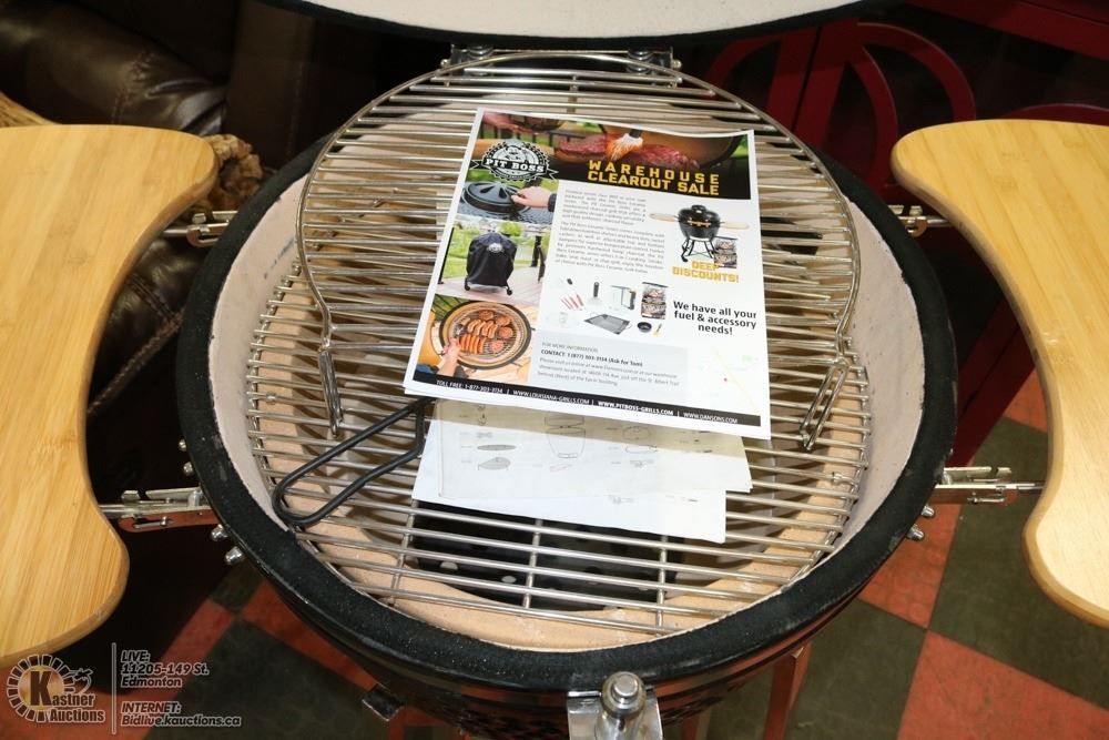 573 SQ INCHES TOTAL COOKING AREA, LARGE STAINLESS STEEL CALIBRATED TOP DAMPER, COOKING TEMP RANGE UP TO 700 DEGREES FAHRENHEIT, USES CHARCOAL. OUTDOOR.
