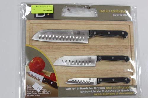 NEW 3 PC SANTOKU KNIFE AND CUTTING BOARD SET