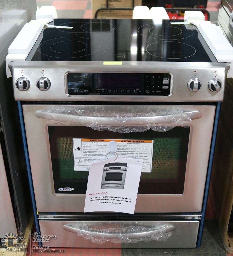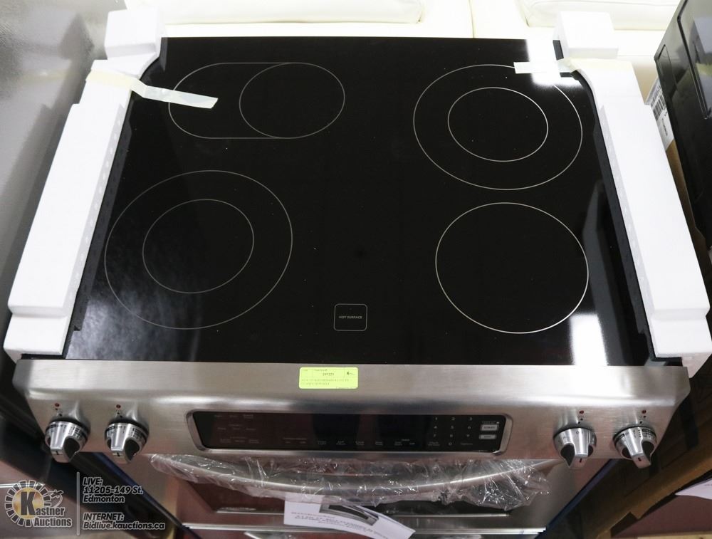 CLEANING SLIDE IN ELECTRIC RANGE, STAINLESS STEEL, ARCHITECT SERIES II, TRUE CONVECTION WIT T.H.E. (THIRD HIDDEN ELEMENT) AND 4.1 CU. FT CAPACITY, FEATURES BREAD PROOFING AND DEHYDRATION FUNCTIONS, EASY CONVECT CONVERSION SYSTEM AND CLEAN BAKEHIDDEN ELEMENT. APPLIANCES MANUFACTURE WARRANTY UNTIL AUGUST 23/2018 ALL BIDS ARE SUBJECT TO BANK, BAILIFF OR OWNER APPROVAL