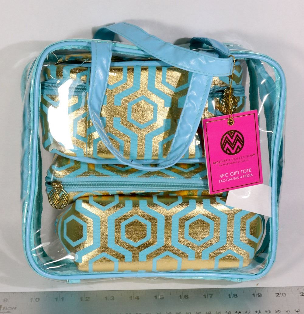 NEW, BY MACBETH COLLECTION, 4 PCS TEAL & GOLD ZIPPERED BAGS & CLEAR ZIPPERED CASE