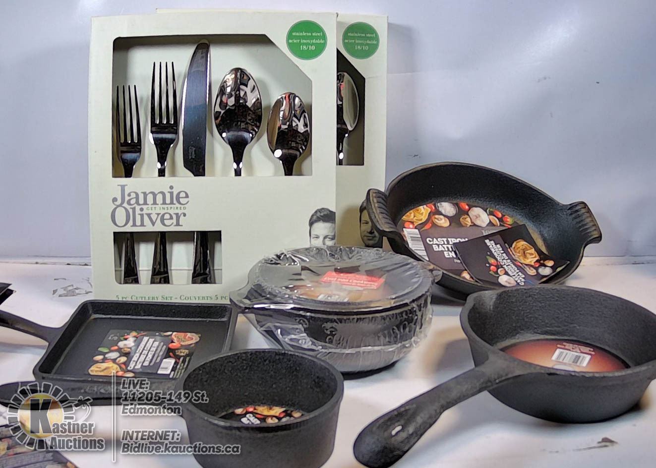 CASSEROLE DISH, FRYING PAN, 1 WITH LID, W/NEW 2 JAMIE OLIVER 10 PC CULTERY SETS STAINLESS STEEL(ALL MADE IN PRC)