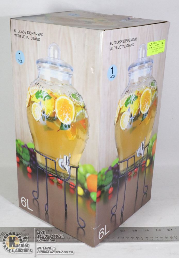NEW 6L GLASS DRINK DISPENSER WITH METAL STAND