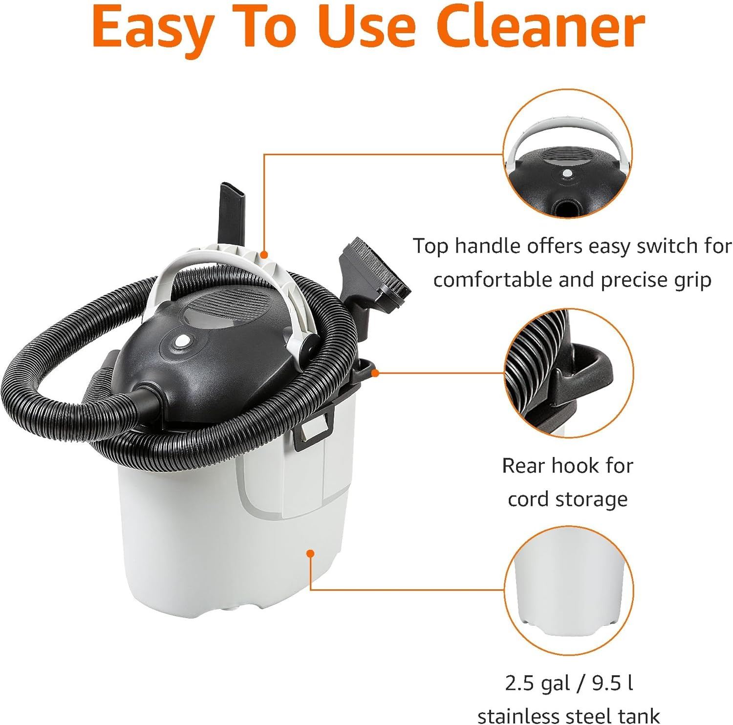 -INCLUDES A 2.5 GALLON WET/DRY VACUUM MADE OF DURABLE POLYPROPYLENE IN GRAY AND BLACK