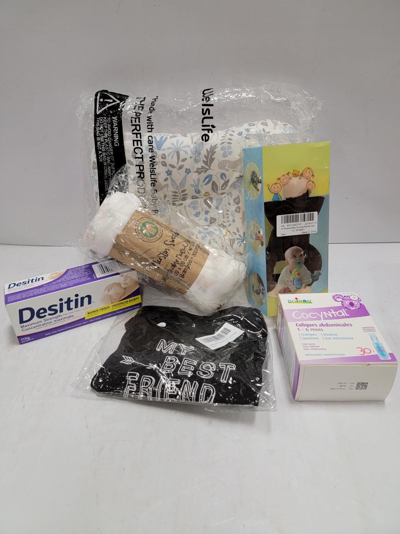 NEW BABY ITEM LOT: INCLUDES ONSIE, PILLOW, SWADDLE