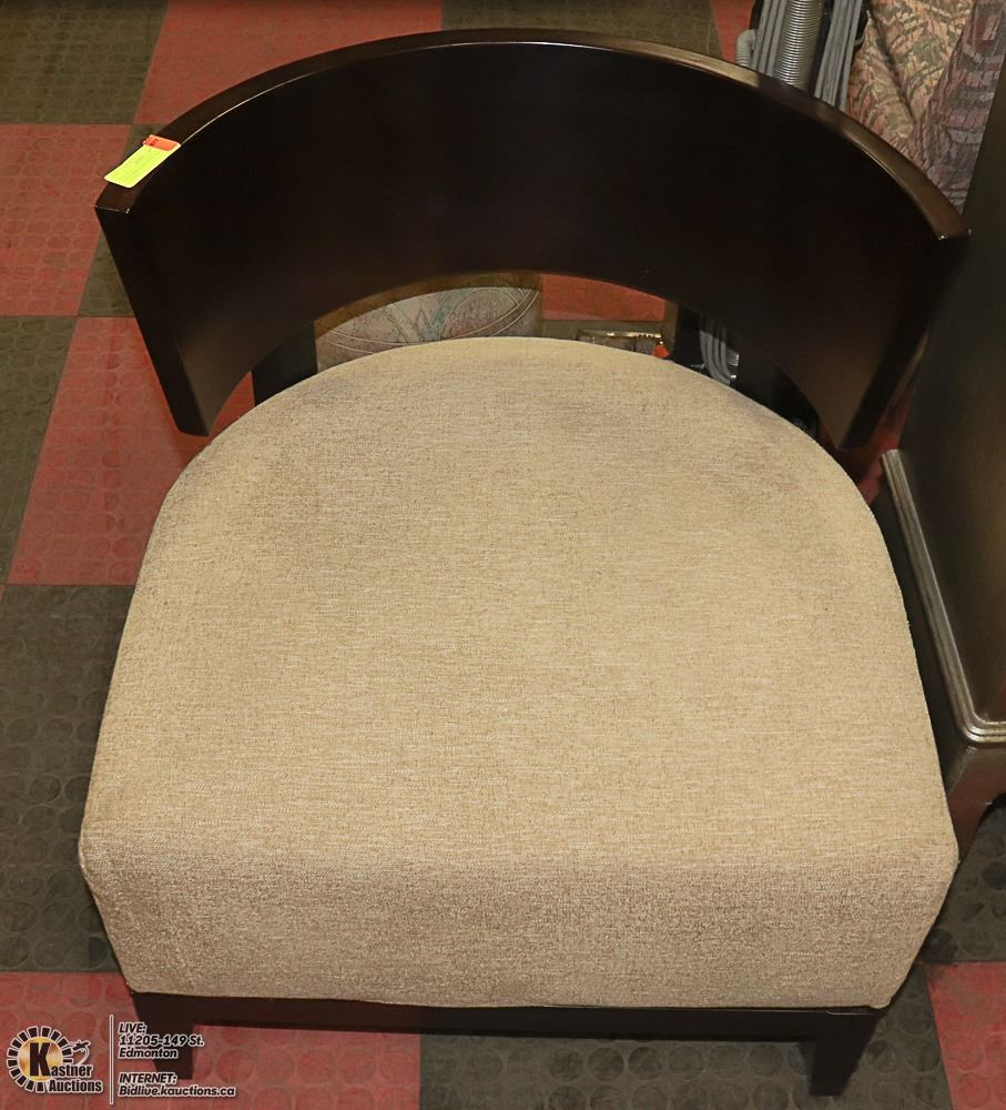 BARREL BACK LOUNGE/ACCENT CHAIR - CURVED DARK WOOD BACK, SOLID WOOD FRAME, THICK PADDED SEAT (25"W X 26.5"L X 28"H) - FURNITURE