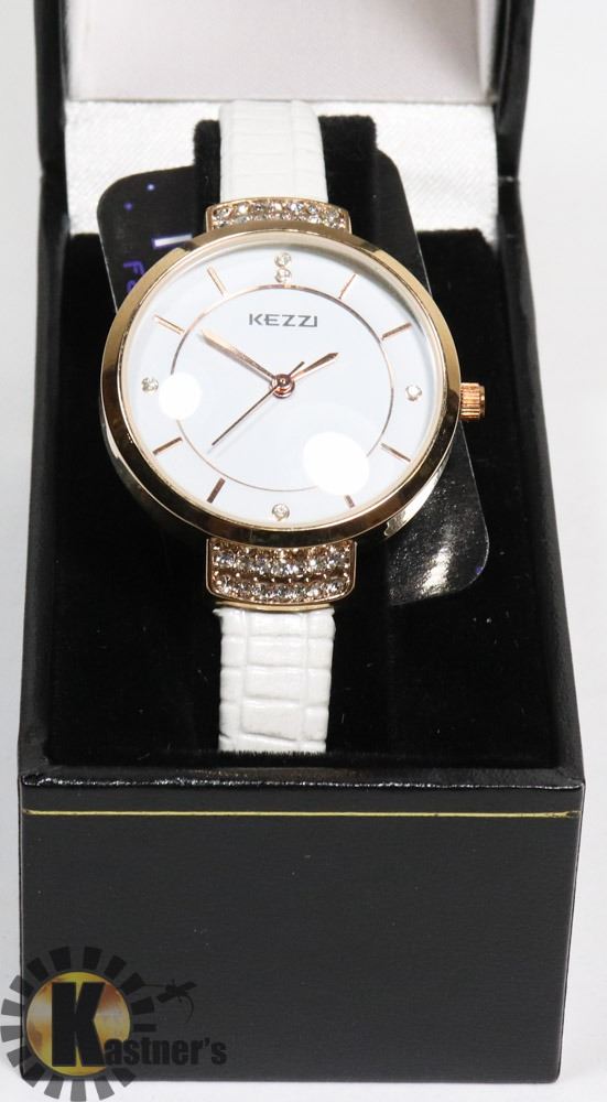WATCH LADIES - NEW BRAND NAME KEZZIE WATCH WHITE GENUINE LEATHER STRAP IN BLACK CASE BOX-JEWELRY