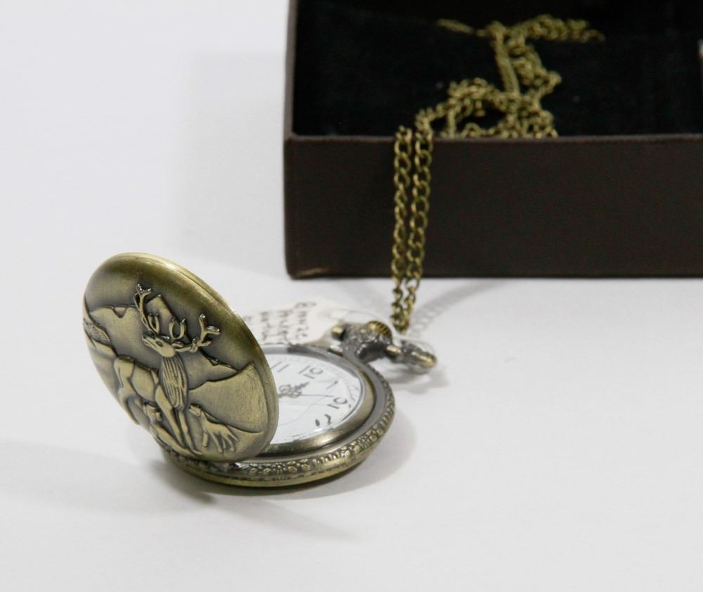 NEW BRONZE POCKET WATCH WITH CHAIN, ELK AND