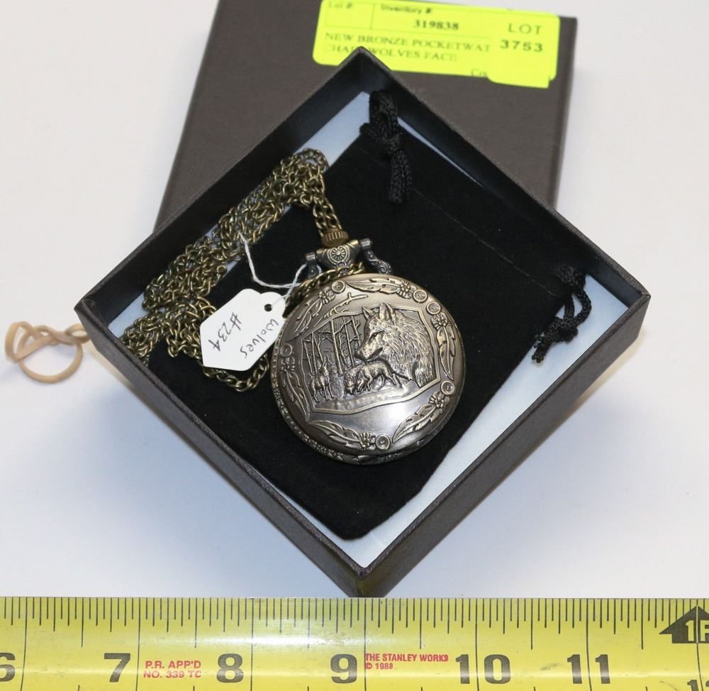 NEW BRONZE POCKETWATCH WITH CHAIN WOLVES FACE