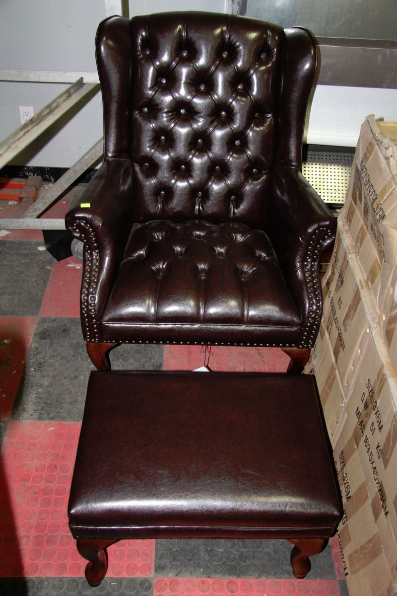 NEW BROWN LEATHERETTE PARLOR CHAIR WITH OTTOMAN