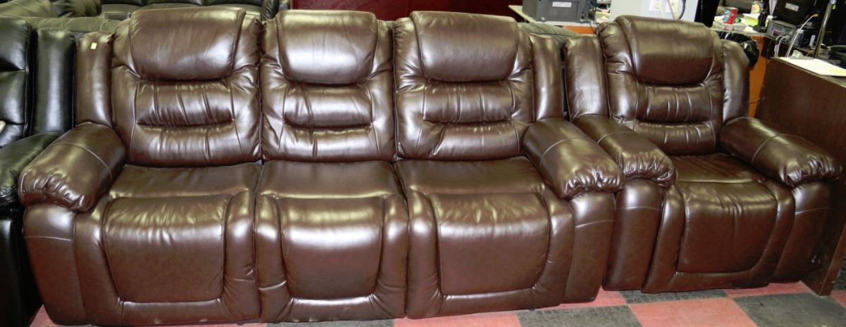 NEW CARL BROWN LEATHER RECLINING SOFA AND CHAIR