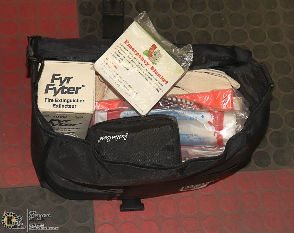 KIT, BOOSTER CABLES, TOW ROPE, FIRE EXTINGUISHER, PUNCTURE SEAL, SAFETY FLARES, HELP SIGNS, GAS SIPHON, & MORE