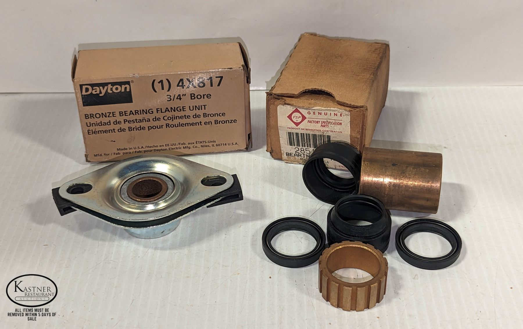 1 x DAYTON PART # 4X817 BRONZE BEARING FLANGE UNIT; PLUS 1 x GENUINE FACTORY PART # 285136 CENTER POST BEARING **ALL ITEMS MUST BE REMOVED BY 5PM MONDAY, AUGUST 28TH, 2023. ALL REMAINING ITEMS WILL BE SUBJECT TO A $6.00 PER DAY STORAGE CHARGE. ANY ITEMS REMAINING AFTER MONDAY, SEPTEMBER 11TH, 2023, 2023 WILL BE CONSIDERED FORFEITED. NO REFUNDS WILL BE ISSUED FOR FORFEITED ITEMS.** TO SCHEDULE A PICK UP APPOINTMENT CLICK HERE