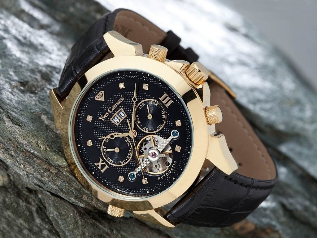 WATCH W/ MONTH/DAY CHRONOGRAPHS & DATE. BLACK LEATHER BAND. MSRP 299