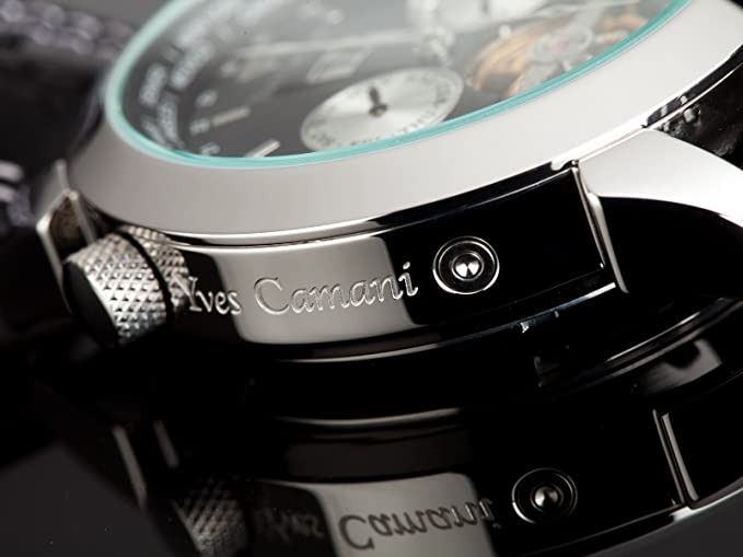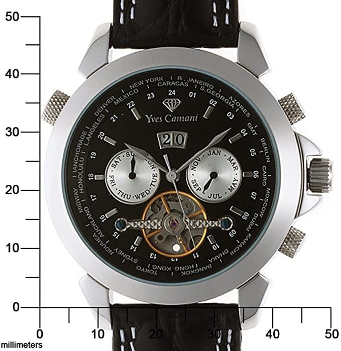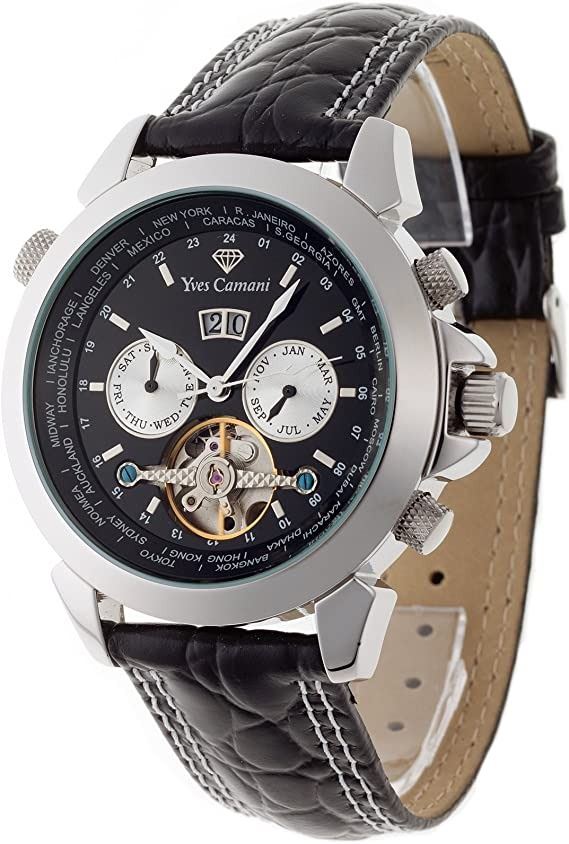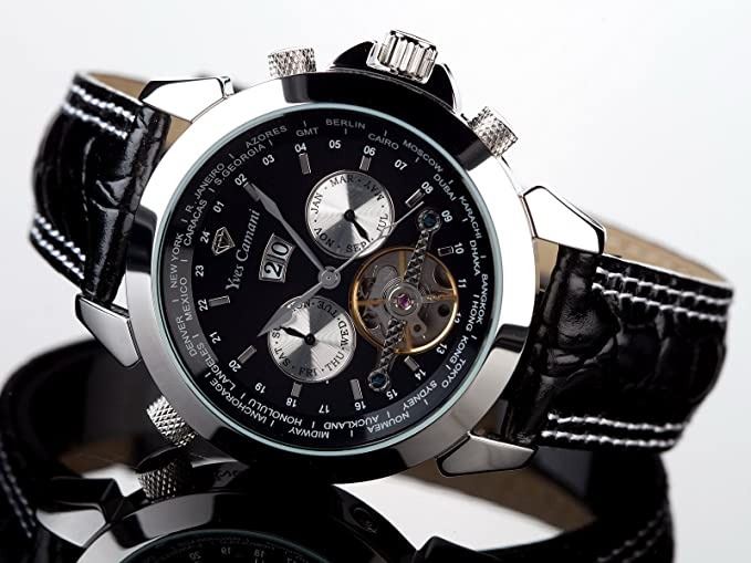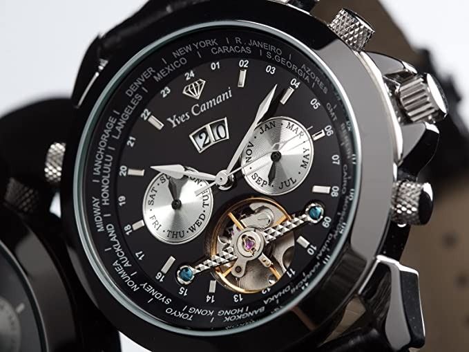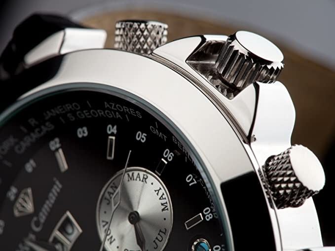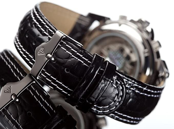 WATCH WITH BLACK LEATHER STRAP. DUAL CHRONOS ARE WHITISH-YELLOW. JEWELLERY.
