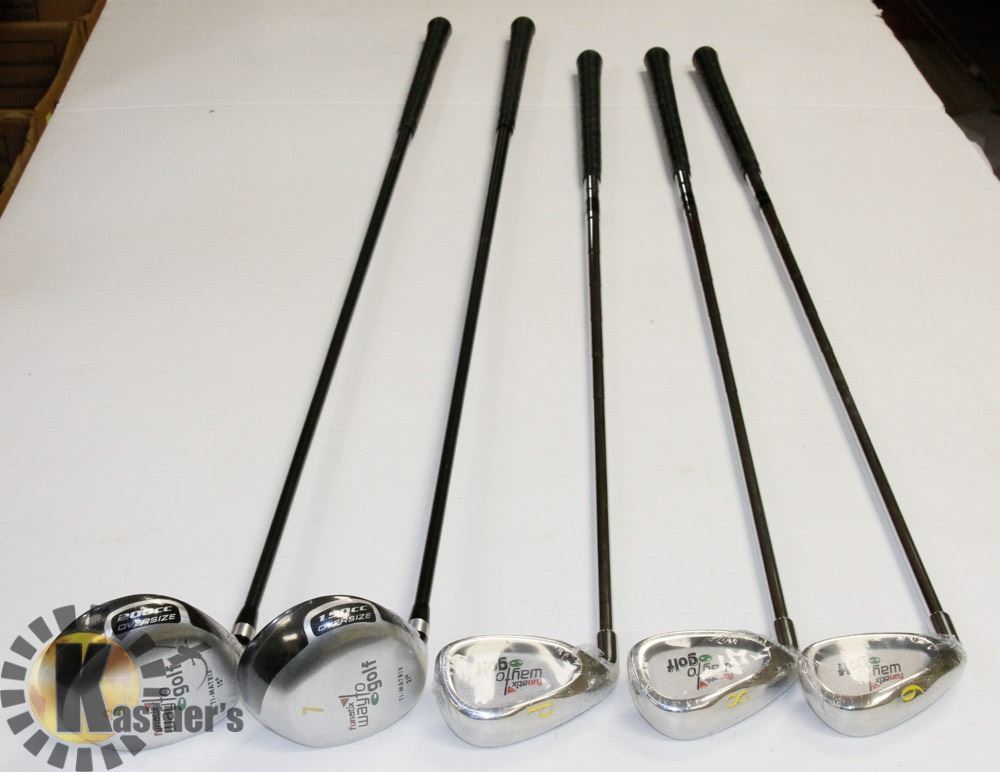 HANDED GOLF CLUB SET, INCLUDES DRIVER, PUTTER, WEDGE, 5 WOOD, 5 IRON, 7 IRON AND 9 IRON. SPORTS, OUTDOORS.