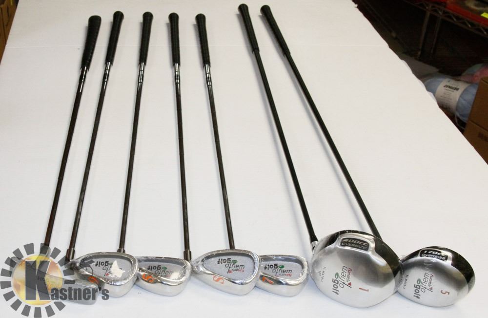 HANDED GOLF CLUB SET, INCLUDES FAIRWAY DRIVER NO 3, FAIRWAY WOOD NO 7, PUTTER, WEDGE, #5 IRON, #7 IRON, #9 IRON. SPORTS, OUTDOORS.