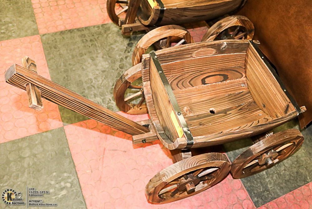 WHEELED PLANTER, FLAME BURNT WOOD WITH BLACK METAL TRIM AND DRAIN HOLE (30.5"L X 15"W X 12.5"H) (17 INCHES HIGH AT HITCH/HANDLE)
