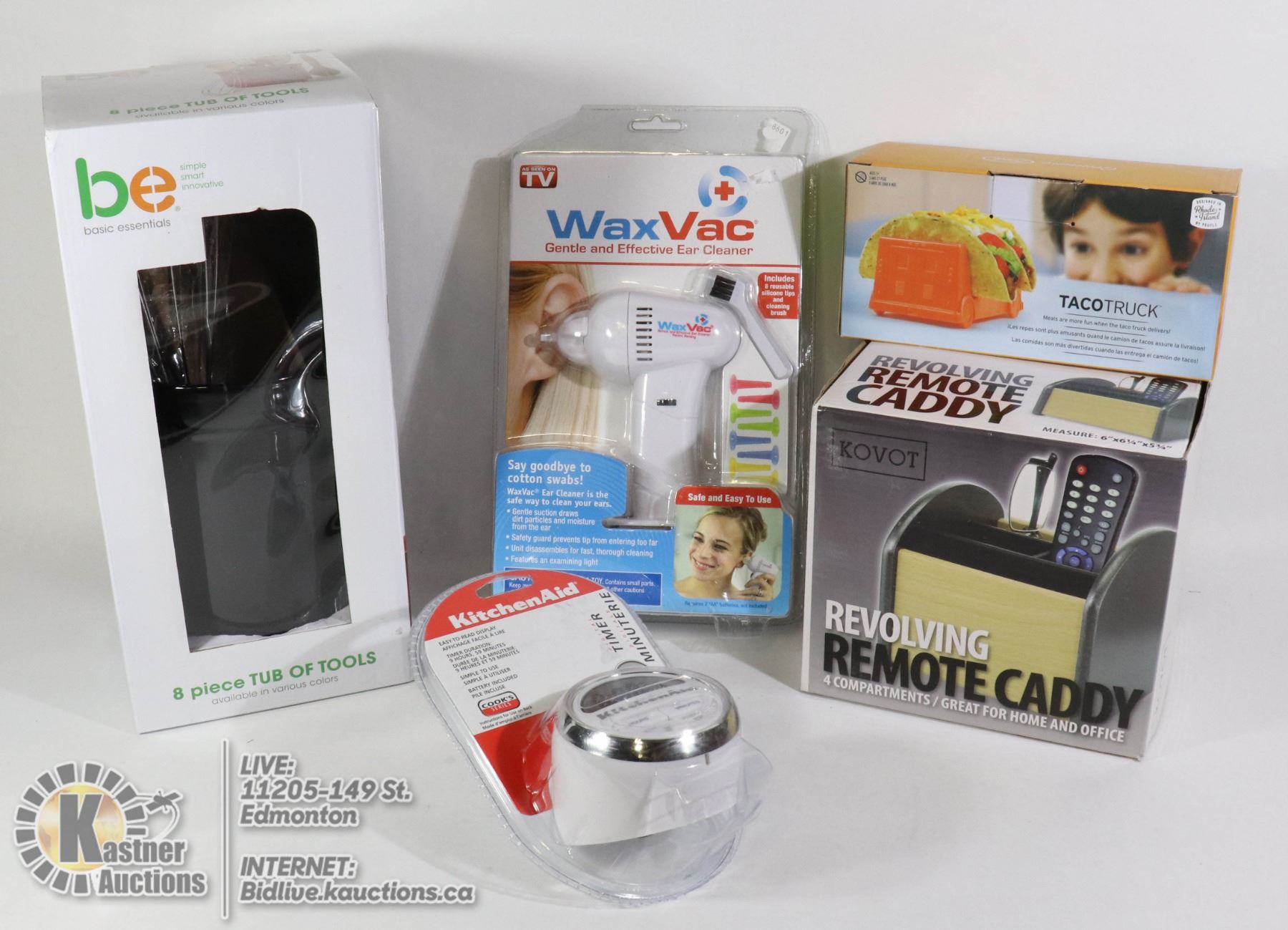 TUB OF TOOLS, WAXVAC EAR CLEANER KIT, TACO TRUCK, REVOLVING REMOTE CADDY, KITCHEN AID TIMER & MORE. HOME