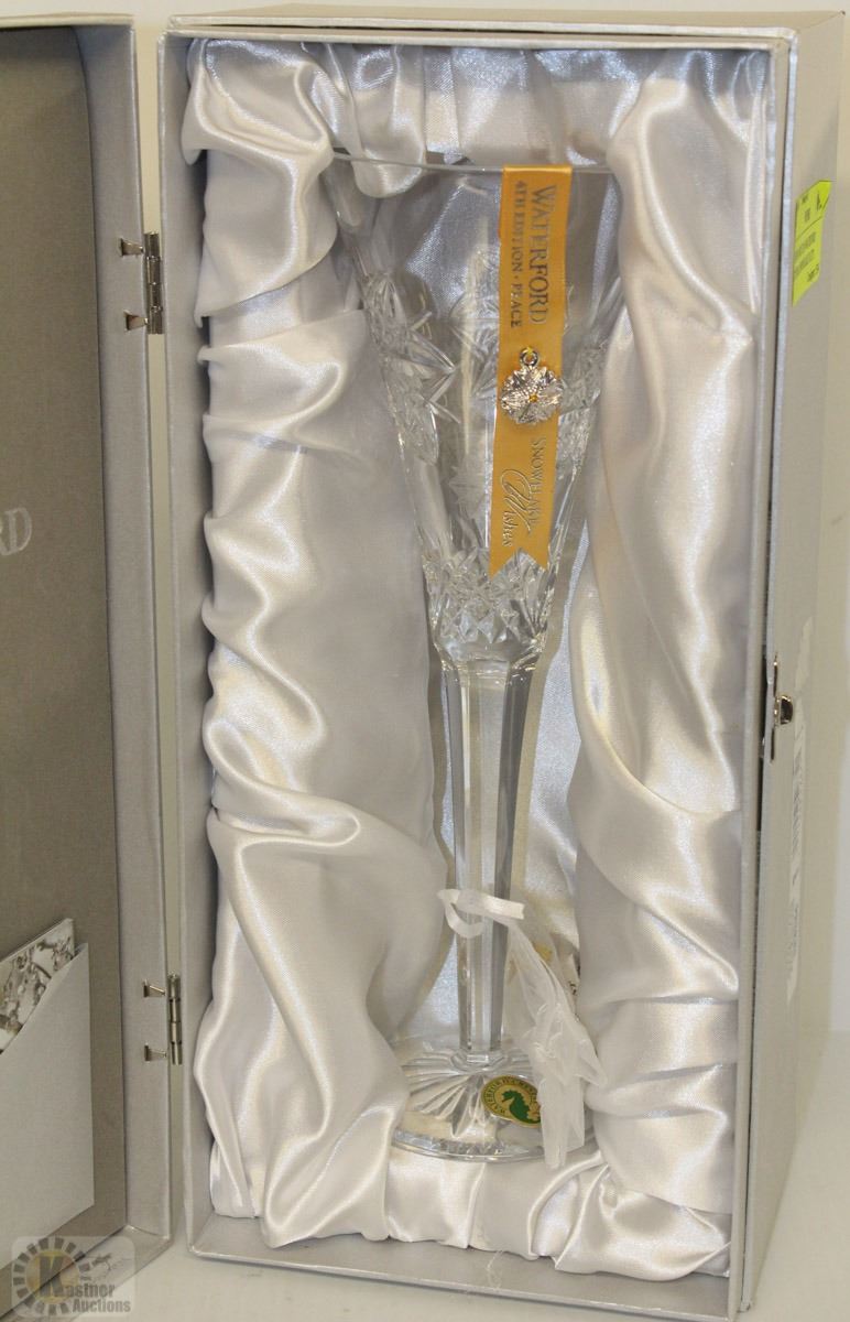 "PEACE" - 4TH EDITION IN THE SNOWFLAKE WISHES COLLECTION. COMES WITH ITS ORIGINAL WATERFORD SATIN LINED BOX, STICKER LABEL, PAPERWORK & LISMORE TOASTING ORNAMENT. CRYSTAL CHAMPAGNE FLUTE IS CUT WITH A SNOWFLAKE PATTERN. (10.2"H)