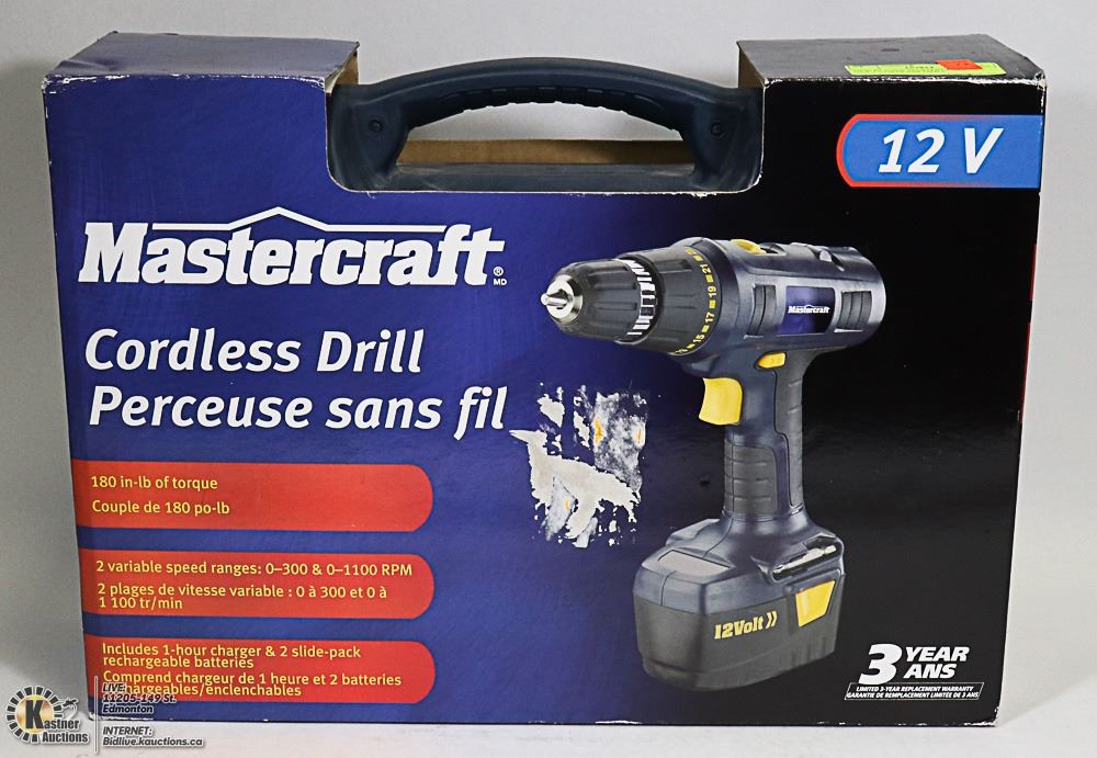 MASTERCRAFT CORDLESS DRILL IN CASE ,NEW,INCLUDES CHARGER AND TWO SLIDE PACK BATTERIES ,180 IN/LB TORQUE-TOOLS