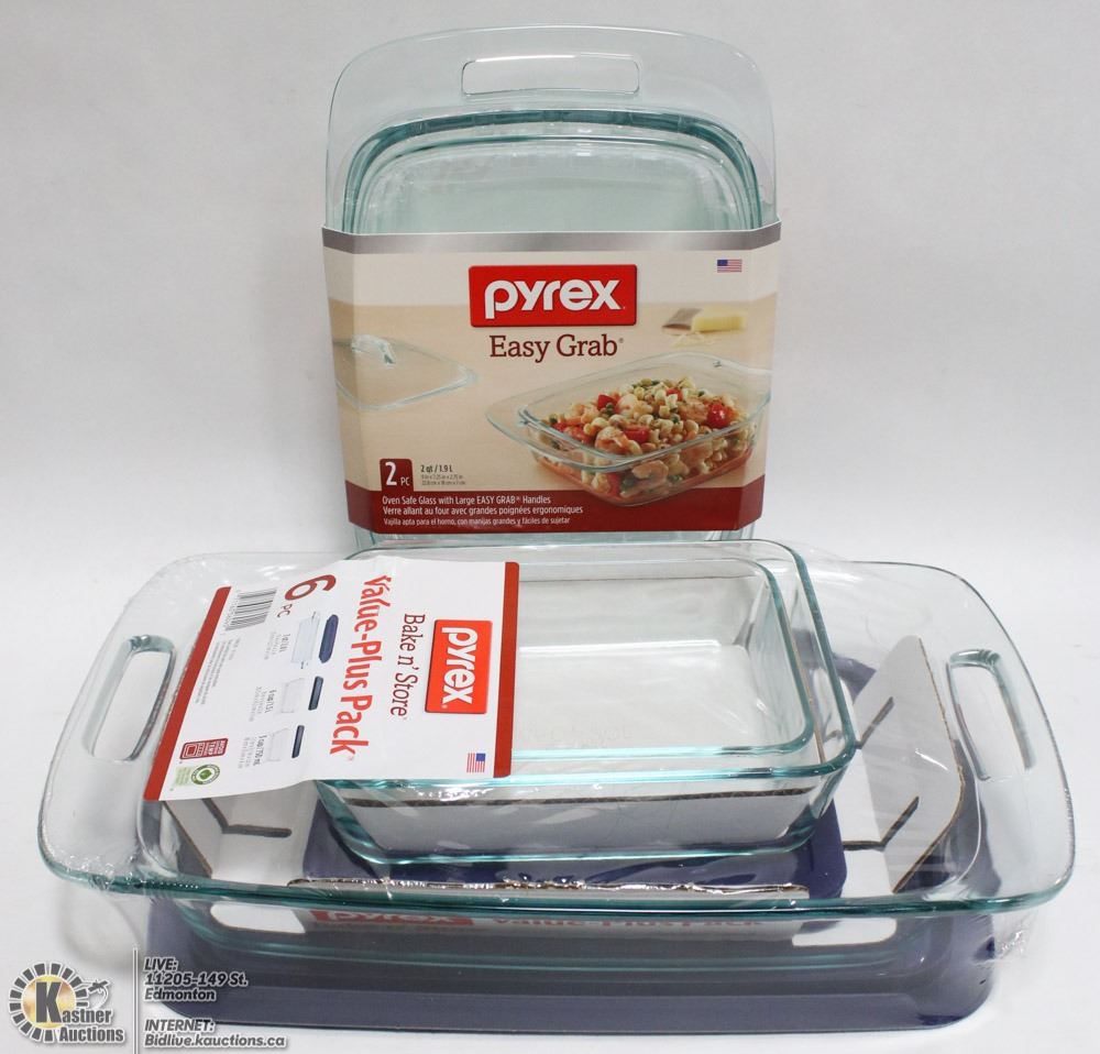6 PIECE BAKE 'N STORE - 3 QT OVEN SAFE EASY GRAB, 6 & 3 CUP GLASS STORAGE PLUS LIDS; 2 QT OVEN SAFE EASY GRAB WITH GLASS LID