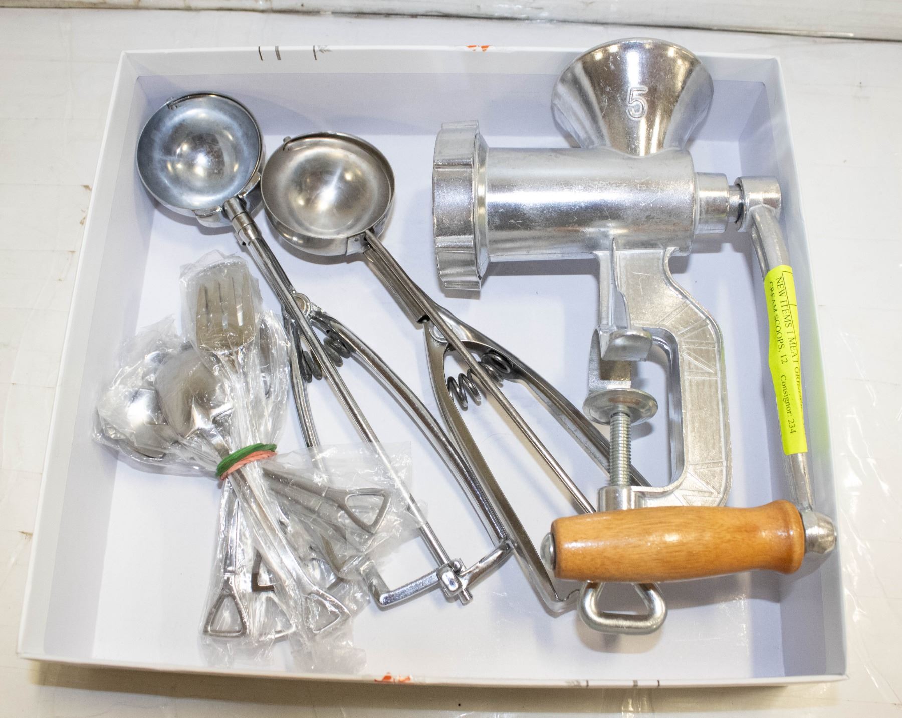 NEW ITEMS 1 MEAT GRINDER, 2 ICE CREAM SCOOPS, 12