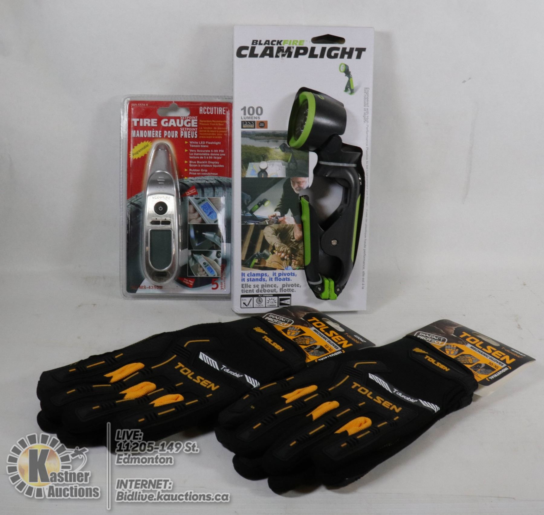 100 LUMENS, 2 DURABLE MECHANIC GLOVES SIZE X-LARGE, TIRE GAUGE