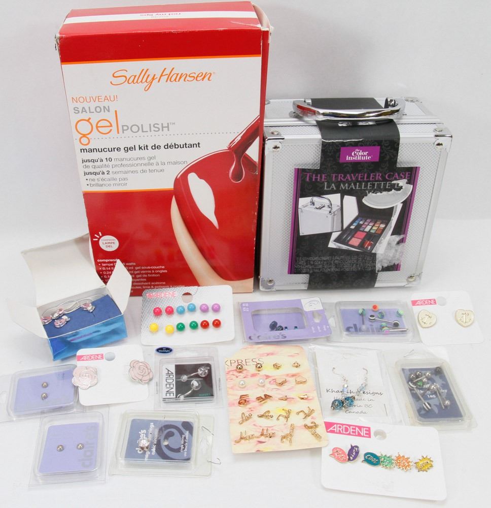 TRAVEL KIT W/AVON MATCHING EAR RING/NECKLACE SET & ASSORTMENT OF BODY PIERCING JEWELRY, EARRING SETS. MISC