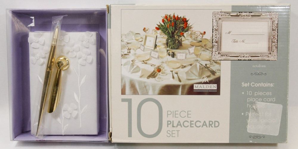 DESIGNS 10 PC WEDDING SITTING TABLE NAME CARD SET W/JACK & JILL PEN SET. GENERAL
