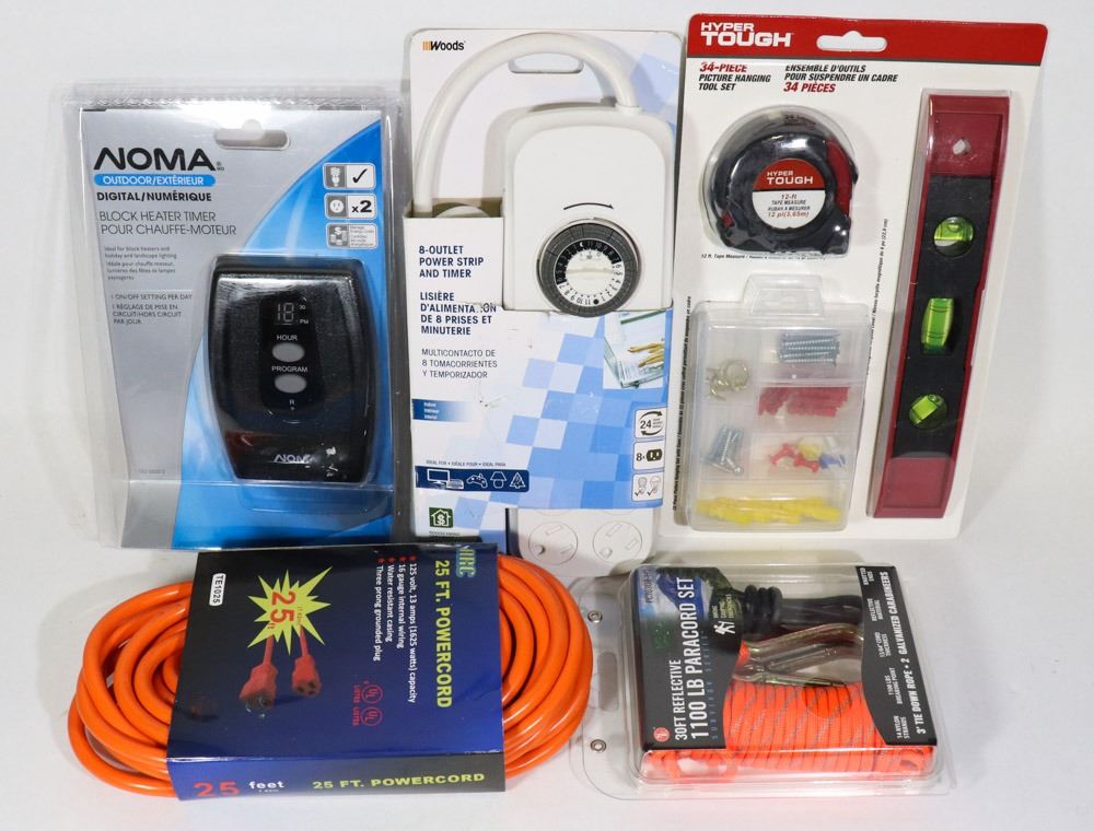 SET 34 PC SET, 8 OUTLET POWER STRIP & TIMER, 25 FOOT OUT CORD & BLOCK HEATER. HOME