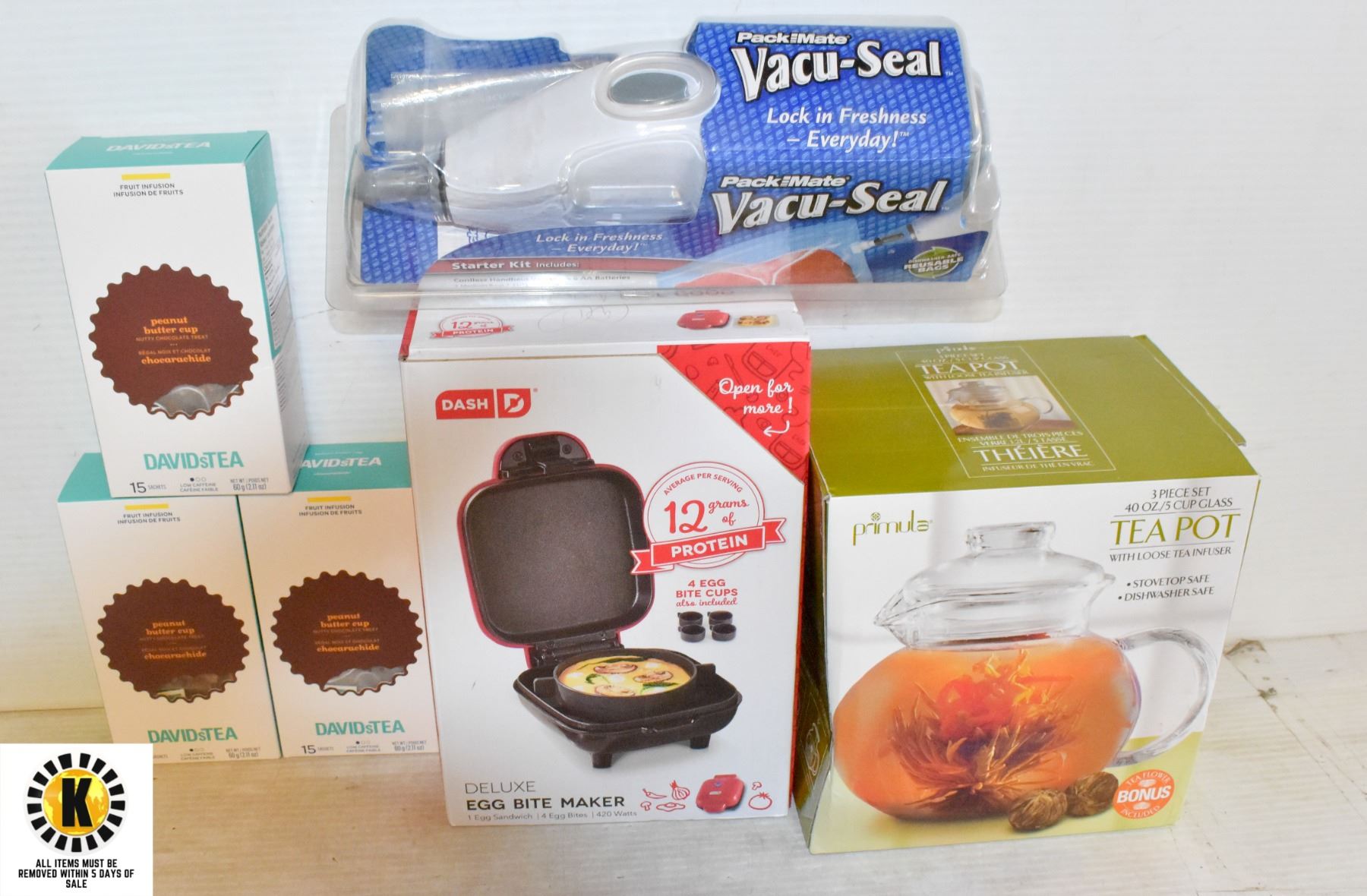 TEA INFUSER 5 CUP W/NEW DASH EGG MAKER & PACK MATE VACUUM-SEAL KIT W/DAVID TEA FRUIT INFUSION PEANUT BUTTER CUP 3 BOXES OF 15