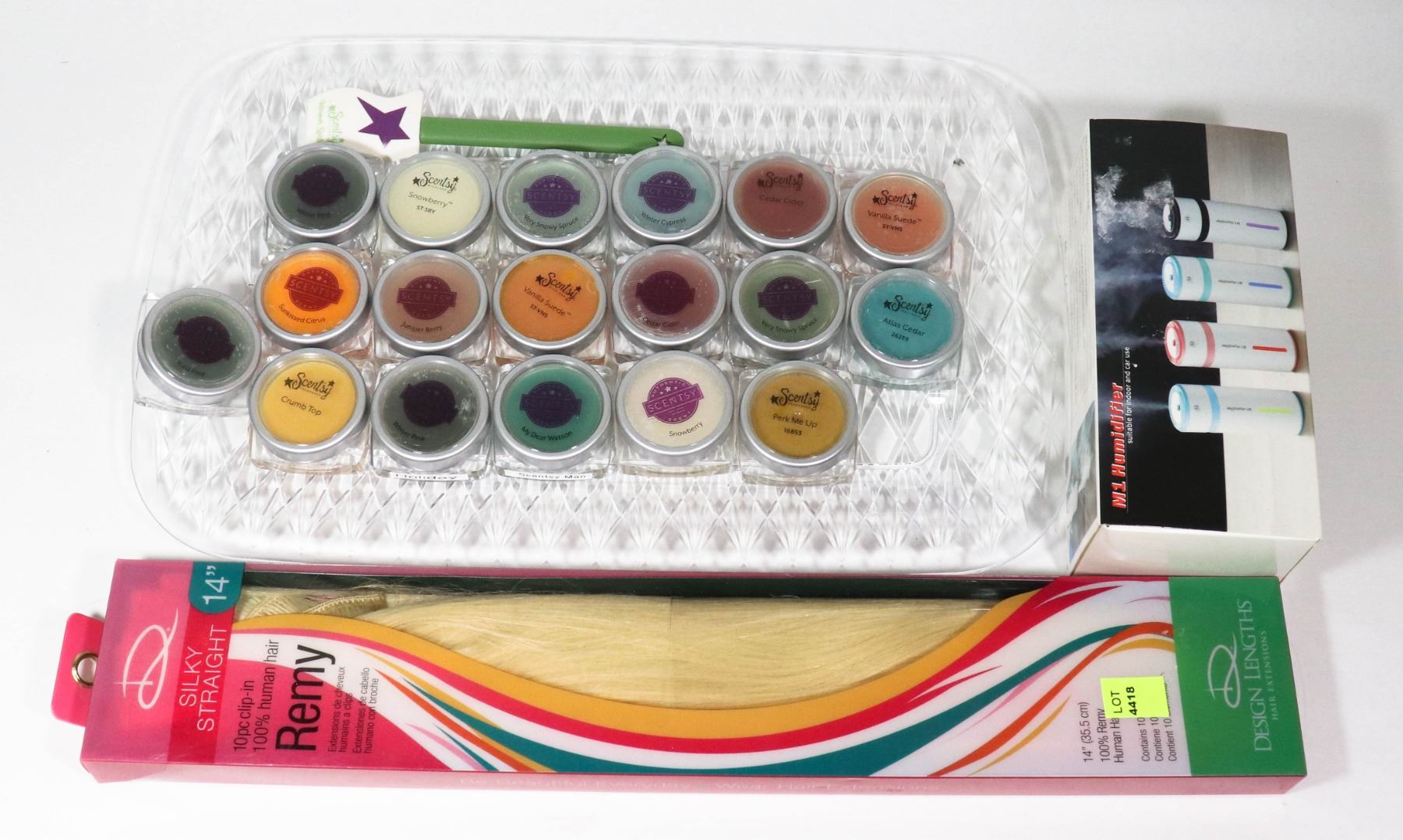 10 PC 100% HUMAN HAIR PLATINUM BLONDE PRE-ATTACHED CLIPS W/MI HUMIDIFIERS INDOOR/CAR SET OF 4 W/TRAY OF 18 SCENTSY VARIETY W/SPREADER. HOME