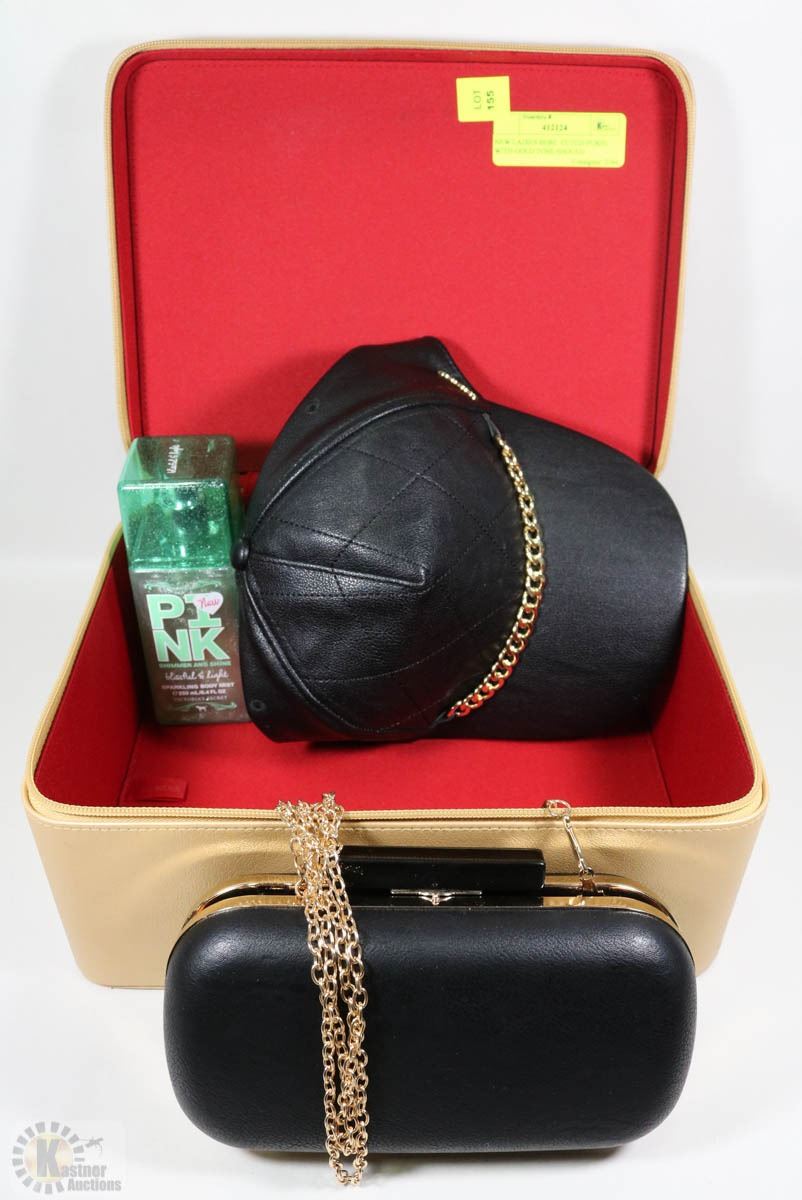 CHAIN, BLACK LEATHER CAP, NEW PINK SPARKLING MIST IN GOLD COLOR CASE