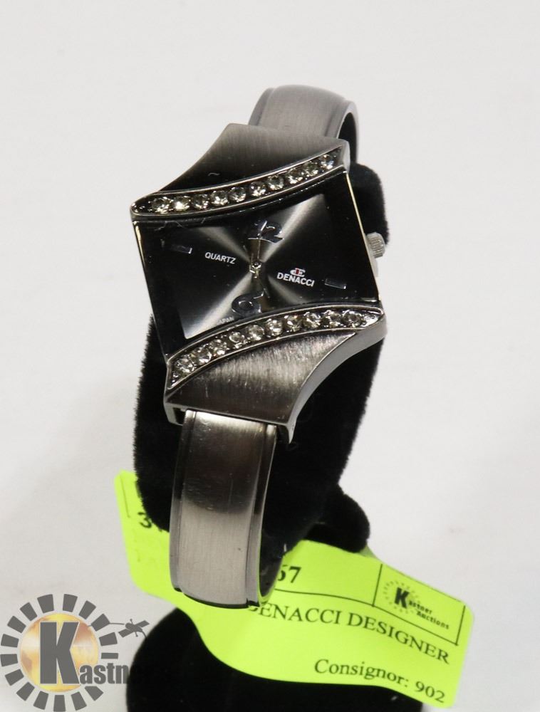 WATCH - BLACK TWISTED SQUARE FACE, QUARTZ, BRUSHED NICKEL FACE & CZs, JAPAN MOVT - ON BLACK WATCH STAND - JEWELRY