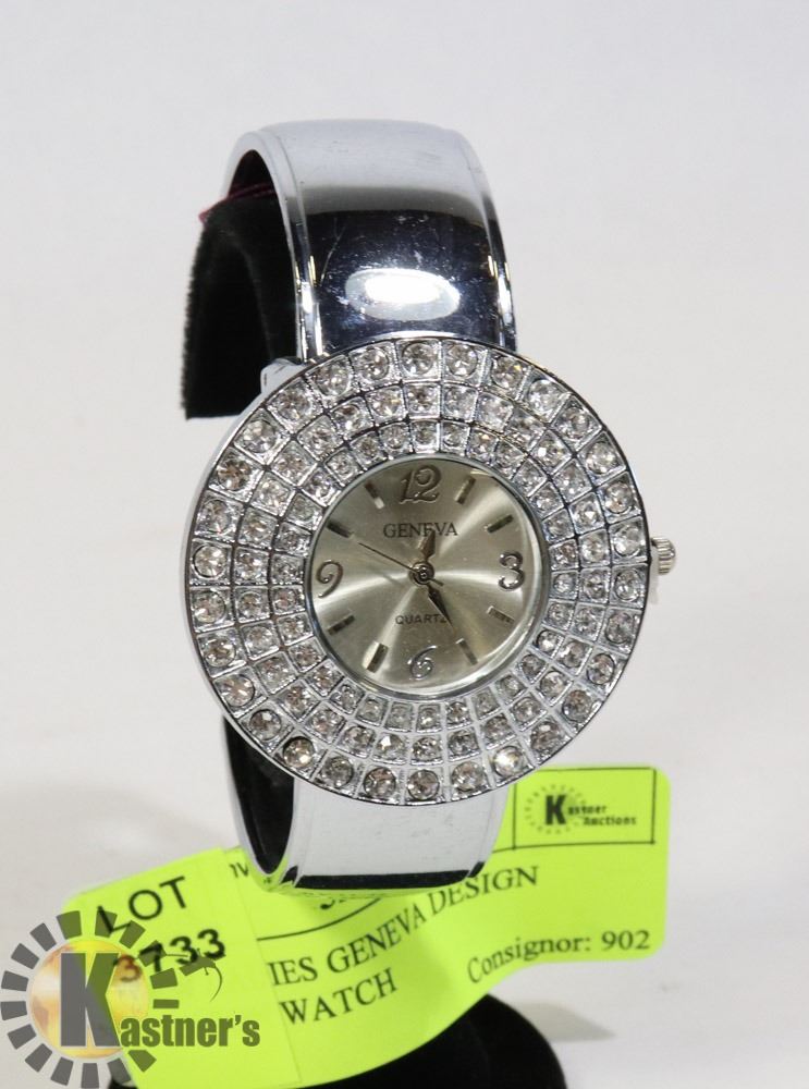 ROUND FACE W/ CZs , SILVER-TONE, QUARTZ, WATER RESISTANT, ON BLACK WATCH STAND - JEWELRY