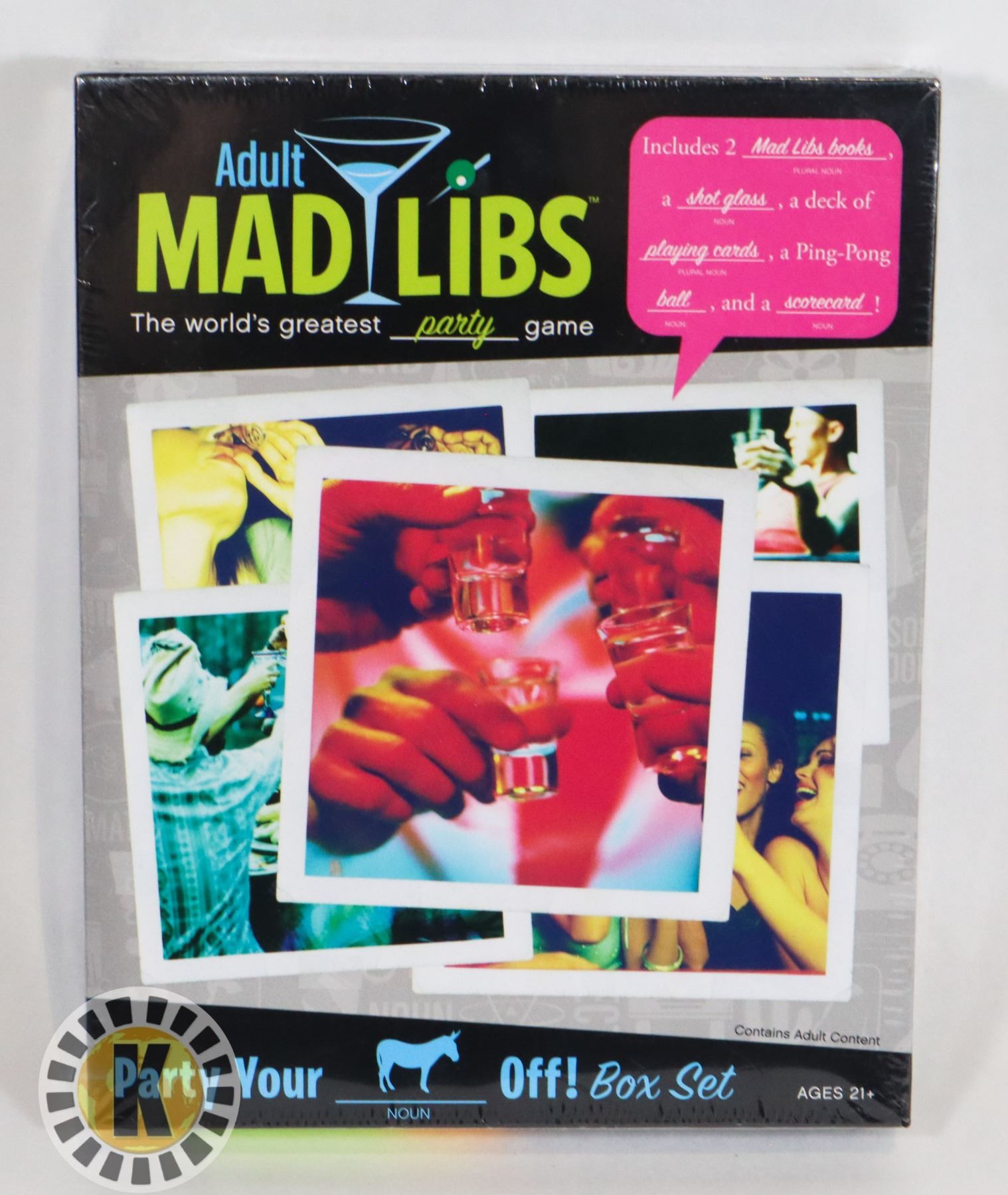 INCLUDES 2 MAD LIBS BOOKS, A SHOT GLASS, DECK OF PLAYING CARDS, A PING PONG BALL AND SCORE CARD.