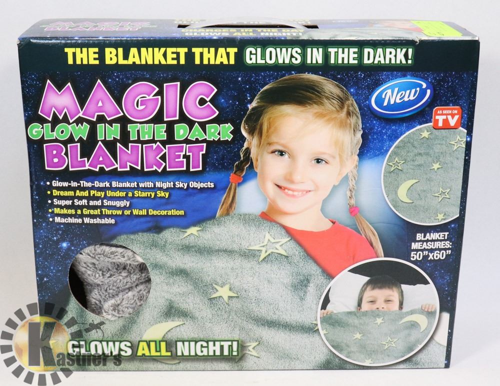 50" X 60". BEFORE FIRST TIME USE LAY BLANKET UNDER A 100W BULB FOR 20+ MINUTES TO CHARGE THE GLOW IN THE DARK FEATURE. HOME