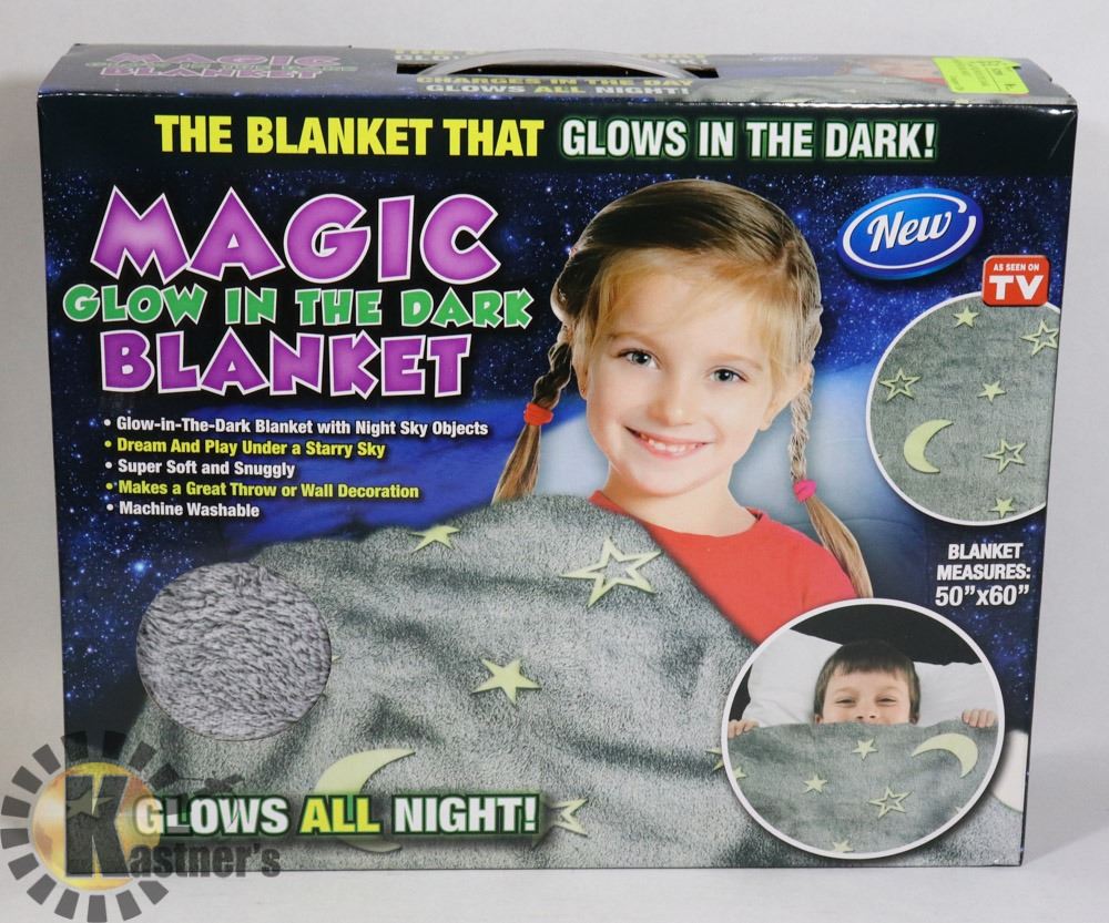 50" X 60". BEFORE FIRST TIME USE LAY BLANKET UNDER A 100W BULB FOR 20+ MINUTES TO CHARGE THE GLOW IN THE DARK FEATURE. HOME