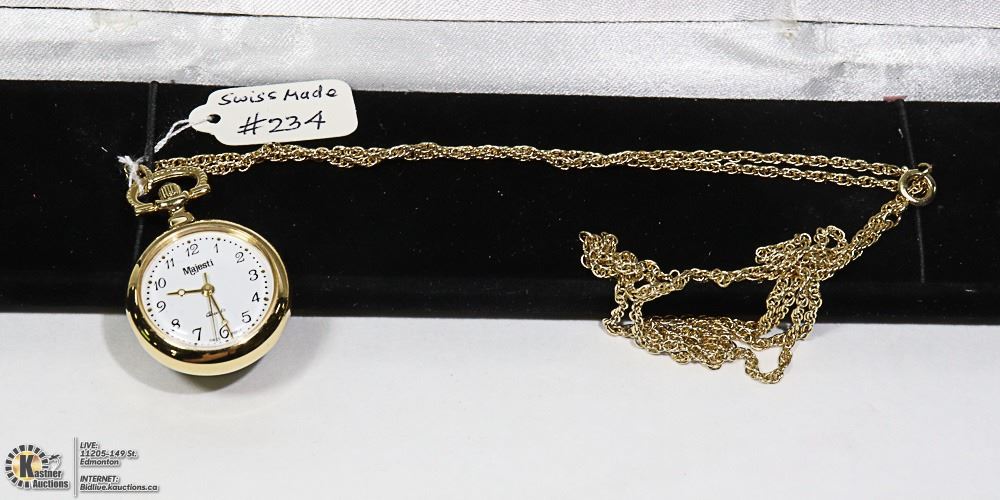 NEW BRAND NAME ( MAJESTI ) SWISS MADE POCKET WATCH IN GOLD TONE LONG 24" CHAIN IN VELVET BLACK CASE-JEWELLERY