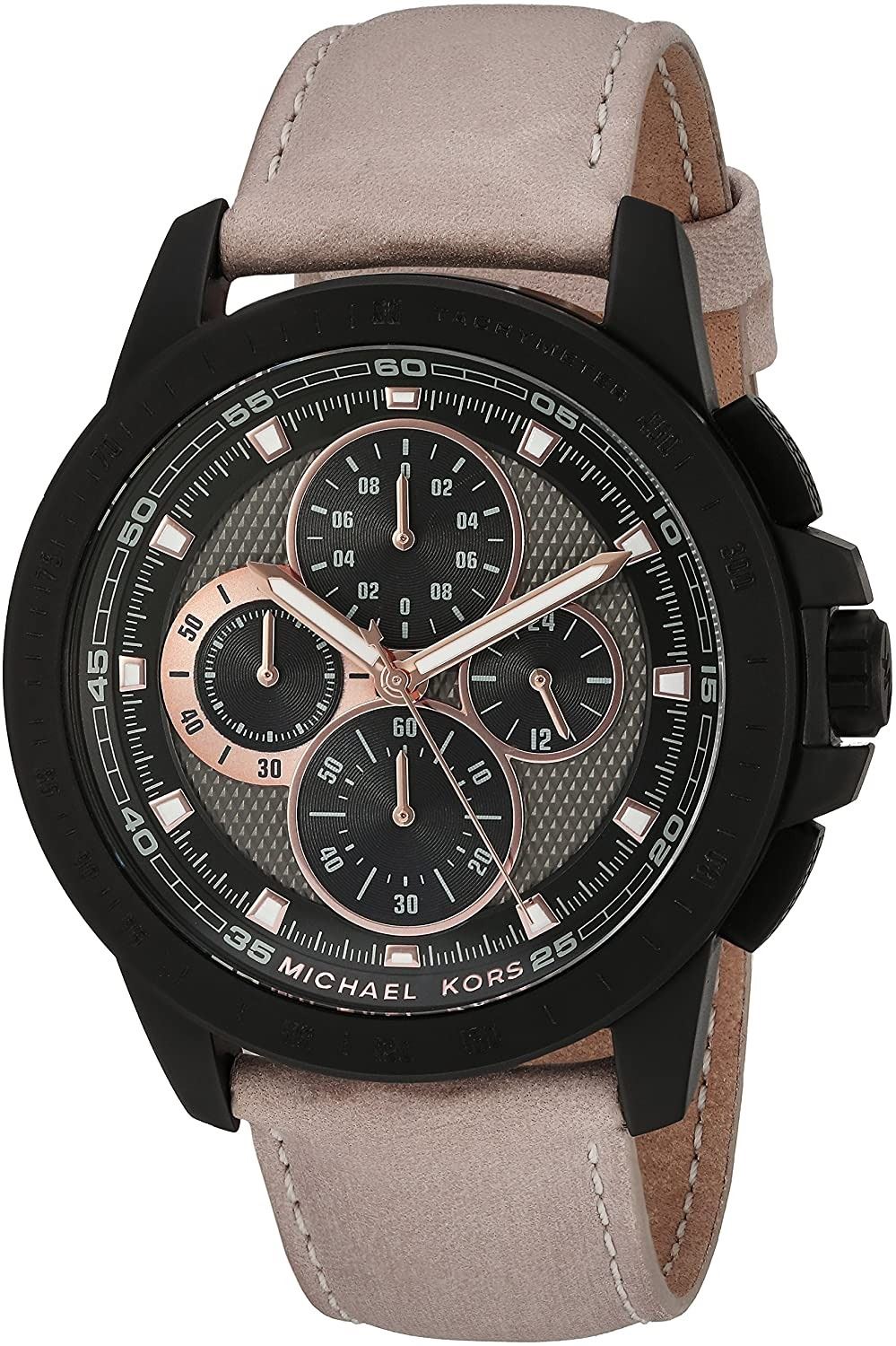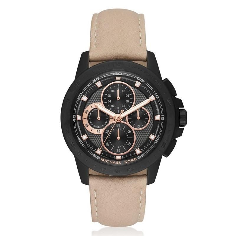BLACK DIAL/BEIGE LEATHER STRAP WATCH. JEWELLERY.