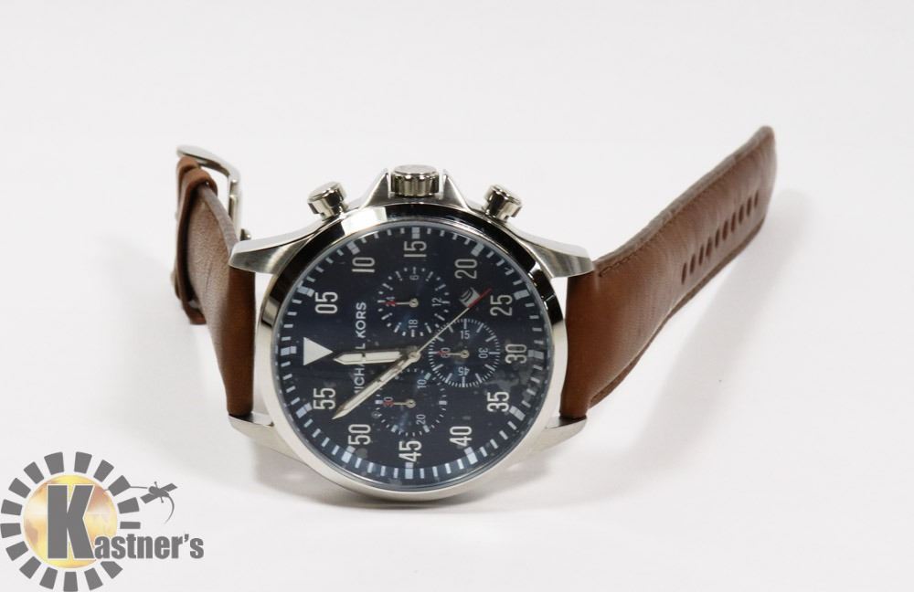 ST. STEEL BEZEL/BROWN LEATHER STRAP 43MM WATCH. JEWELRY