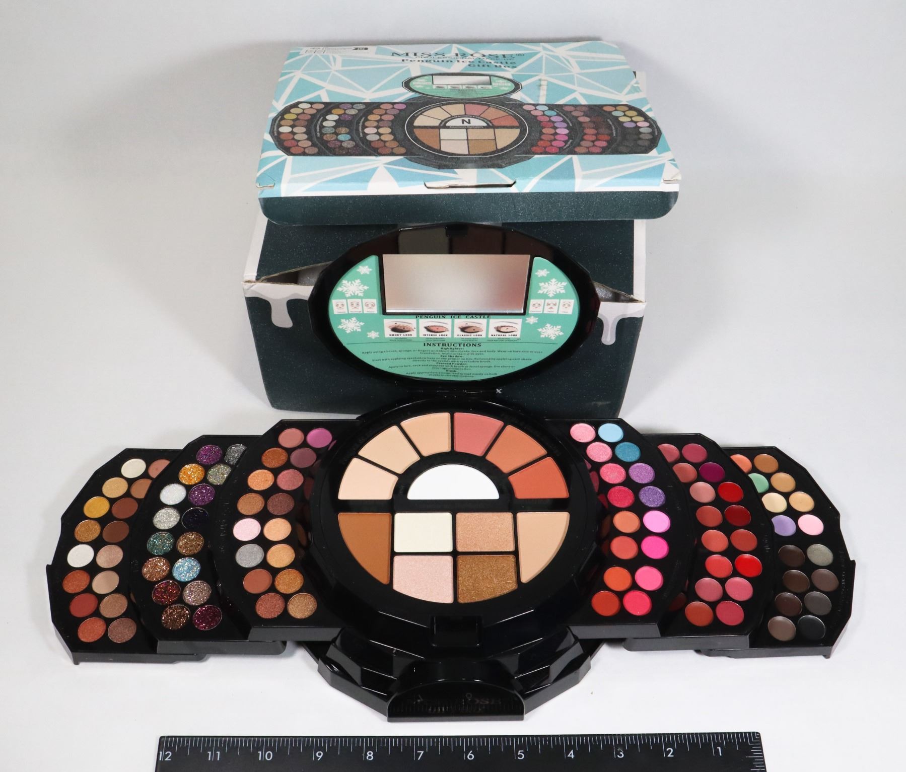 CASTLE. CRUELTY FREE 48-EYESHADOWS, 16 GLITTERS, 16 LIP CREAMS, 8 EYE CONCEALERS, 4 BROW CREAMS, 4 EYE LINER CREAMS, 3 COMPACT COLORS, 3 BLUSHERS, 3 BRONZER AND 4 HIGHLIGHTERS