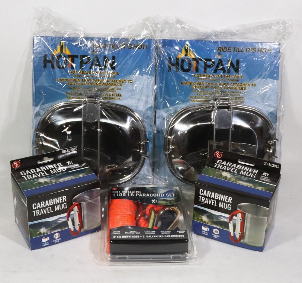 TRAVEL MUGS STAINLESS STEEL W/2 HOT PAN SETS ON THE TRAIL STAINLESS STEEL & 30FT REFLECTIVE 1100 LB PARACORD SET. OUT DOORS