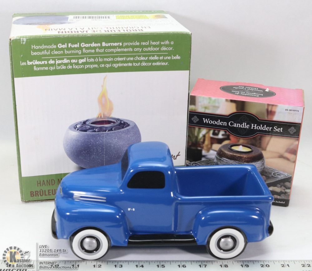 GARDEN BURNER ROUND (GREY) W/ WOODEN CANDLE HOLDER SET & TELEFLORA GIFTS FORD OFFICIAL TRUCK PLANTER