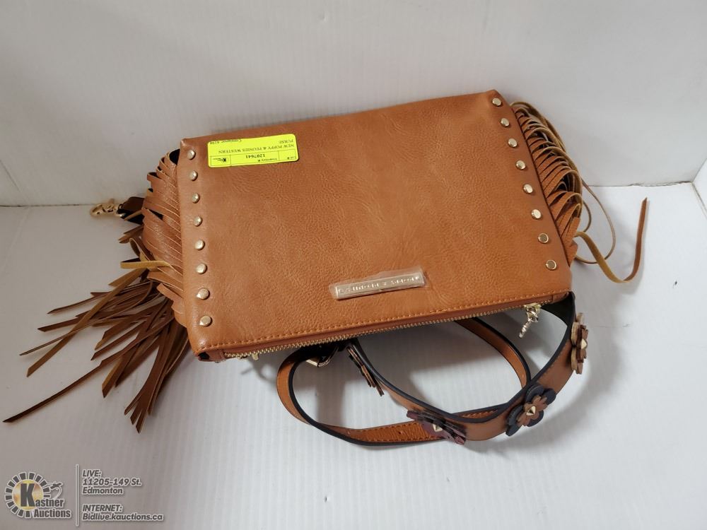 SYNTHETIC, CHESTNUT COLOR, WITH DETACHABLE NARROW SHOULDER STRAP, HAND LOOP, AND ADDITIONAL WIDER FLOWER MOTIF DETACHABLE STRAP
